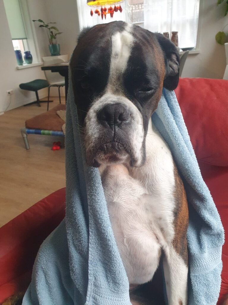 Ik kruip op mijn stoel en krul in elkaar. Merry Christmas schalt het door de radio terwijl ik mijn ogen weer dicht doe. De dag kruipt voorbij. Ik slenter even buiten, ik eet wat brokjes, ik spuug het weer uit en slaap. Tweede kerstdag kruipt voorbij, ik slaap, ik spuug, ik heb diarree en ben zo zielig… Ik wil niets liever dan op schoot liggen, dicht tegen mijn baasje aan.