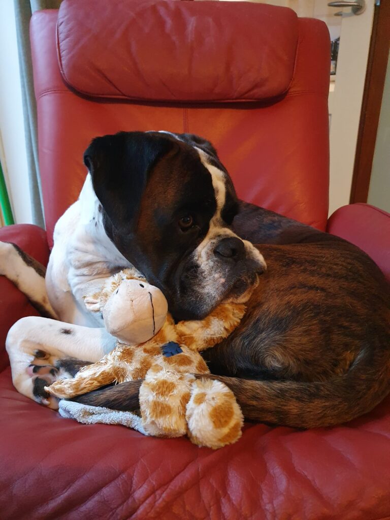 Deze week kwam ik ook mijn grote vriend Binkie tegen op het strand. Ik zag ‘m al uit de verte en rende op hem af met mijn bal nog in mijn bek. Om hem onstuimige te begroeten, liet ik een seconde mijn bal los. Eventjes maar om Binkie een dikke zoen op zijn kop te geven. Daarna draaide ik mij om om de bal weer te pakken. Weg, foetsie, verdwenen als sneeuw voor de zon. En Binkie ook. Bleek dat mijn beste vriend mijn bal in zijn holle kies had verstopt. Gewoon onder zijn hangwang van zijn bek. En ik heb zeker wel 5 minuten gezocht naar mijn bal. Waar kon dat ding toch zijn? Ik had ‘m toch nog nog bij mij? En terwijl Binkie de bal liet stuiteren voor mijn neus, bleef ik maar zoeken op het strand want in de bek van mijn beste vriend kon mijn bal toch niet zitten? Baas vond mij wederom briljant en lachte mij hardop uit. En ik, ik was gewoon mijzelf, boxer, ten voeten uit.