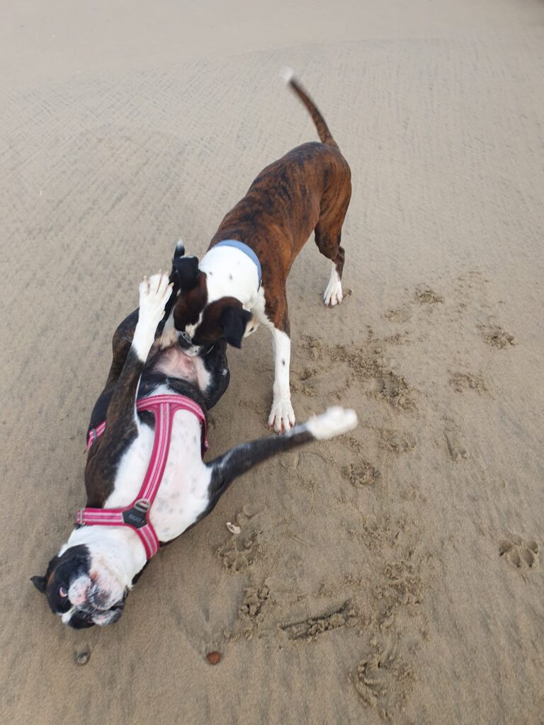 Baasje heeft woord gehouden, de volgende ochtend op het strand tref ik Mila. En ik, ik trek alles uit de kast om haar te behagen. Ik kus, knuffel, kwijl haar helemaal onder. En haar baasjes ook. Ik tover zelfs mijn roze lipstick te voorschijn om die aan Mila te laten zien. En baasje heeft gelijk, zoenen met een soortgenoot is toch het heerlijkste wat er is.